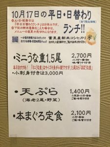 富里市産コシヒカリの新米を使用 ご飯のお代わり遠慮なくお申し付けください。『平日日替わりランチ』はご用意数をこえた場合、メニューの変更又は品切れとなります ご了承下さい。この他、グランドメニューにてうな重等もご用意しております