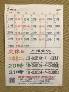 火曜日の営業は11:30〜14:00ラストオーダー(14:30閉店) 17:00〜20:00ラストオーダー(20:30閉店)
