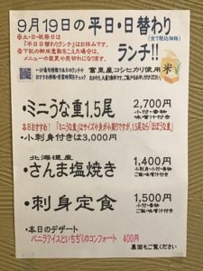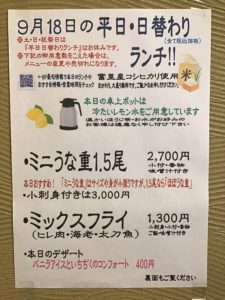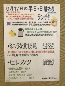 富里市産コシヒカリの新米を使用 ご飯のお代わり遠慮なくお申し付けください。『平日日替わりランチ』はご用意数をこえた場合、メニューの変更又は品切れとなります ご了承下さい。この他、グランドメニューにてうな重等もご用意しております